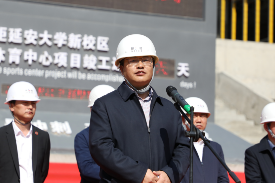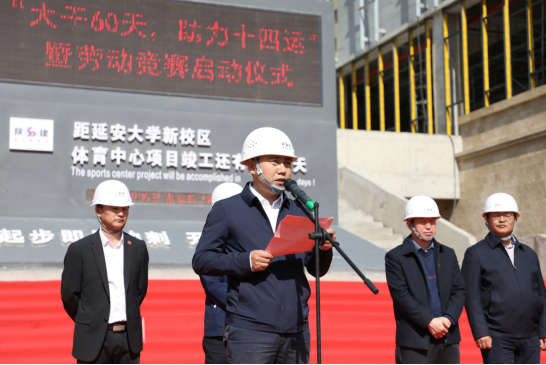 延安大學(xué)黨委委員、副校長楊偉宏致辭,他代表延安大學(xué)全體師生向疫情期間奮戰(zhàn)在一線的施工人員及陜建集團(tuán)表示衷心感謝,對十三建公司承建的延大體育中心項目建設(shè)給予充分肯定。他指出,延安大學(xué)體育中心項目作為十四運重點建設(shè)項目,意義重大。當(dāng)前,項目建設(shè)進(jìn)入60天倒計時,希望全體參建人員從延安精神中汲取力量,大力弘揚愛崗敬業(yè)、艱苦奮斗的勞模精神,進(jìn)一步統(tǒng)一思想,提高認(rèn)識,鼓足干勁,用一流的速度,一流的品質(zhì),展現(xiàn)陜建集團(tuán)的國企風(fēng)采和責(zé)任擔(dān)當(dāng),為第十四屆全運會順利召開貢獻(xiàn)力量。
