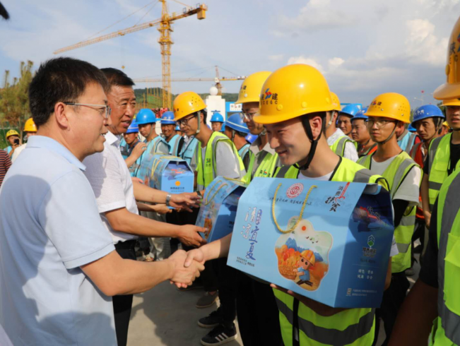 8月10日,延安市政協(xié)副主席、市總工會黨組書記、主席黑樹林一行來到陜建十三建公司南泥灣紅色文化小鎮(zhèn)項目慰問項目一線建設者,為他們送去茶葉、蜂蜜、綠豆、小米等防暑降溫物品。市總工會副主席、女職委主任鄭艷霞,南泥灣開發(fā)區(qū)黨工委副書記折克銀,市總工會辦公室副主任、困難職工幫扶中心主任惠瑞國,市總工會辦公室副主任、宣教部負責人康靖華,陜建十三建公司紀委書記、工會主席張軍祥出席活動。