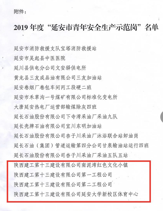 近日,共青團延安市委、延安市應(yīng)急管理局、延安市青年聯(lián)合會聯(lián)合下發(fā)《關(guān)于命名表彰2019年度延安市青年安全生產(chǎn)示范崗的決定》,陜建十三建公司第一工程公司、第二工程公司、南泥灣紅色文化小鎮(zhèn)項目部、延安大學新校區(qū)體育中心項目部四個集體榮獲2019年度“延安市青年安全生產(chǎn)示范崗”榮譽稱號。